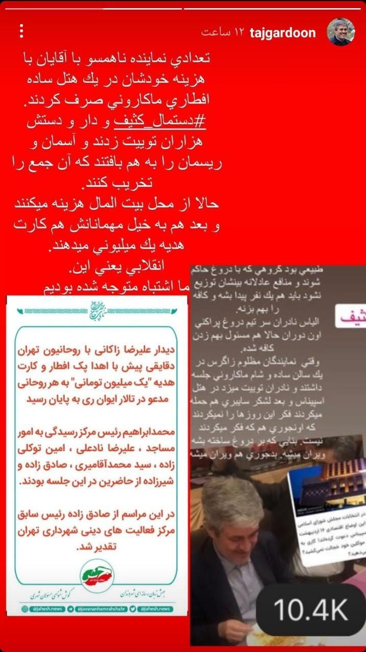 غلامرضا تاج گردون نماینده سابق مجلس در یک استوری نوشت که در نشست افطاری روحانیون با علیرضا زاکانی کارت هدیه های یک میلیون تومانی به روحانیون مدعو توسط شهرداری تهران توزیع شده است .